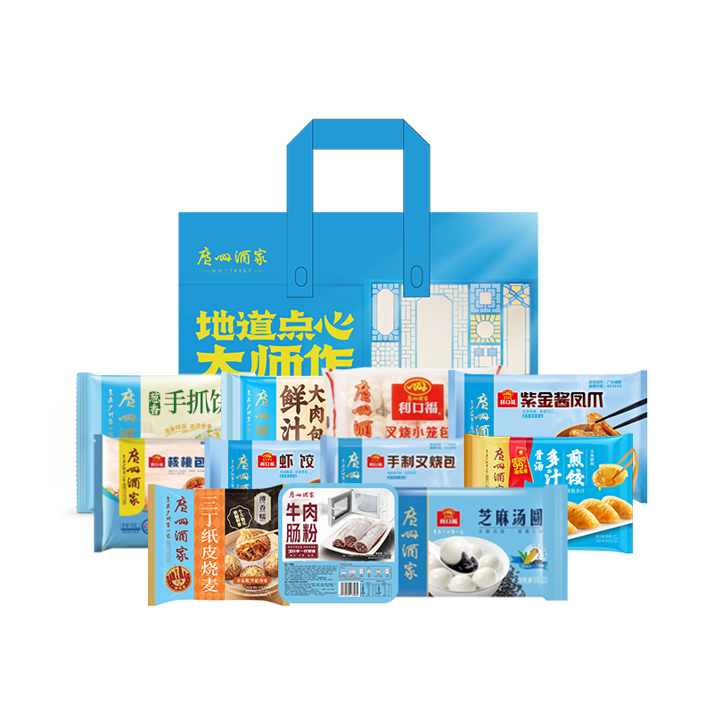 中华粤菜标杆 无需茶楼排队,在家轻松复刻地道广式饮茶体验 省心、放心和正宗的味道 礼盒尺寸:42.5*29.5*26.5cm 内容物:虾饺(160g) 牛肉肠粉(185g) 手制叉烧包(337.5g) 核桃包(337.5g) 三丁纸皮烧麦(240g) 玉米猪肉多汁煎饺(300g) 鲜汁大肉包(390g) 葱香手抓饼(450g) 芝麻汤圆(200g) 紫金酱凤爪(250g) 叉烧小笼包(300g)