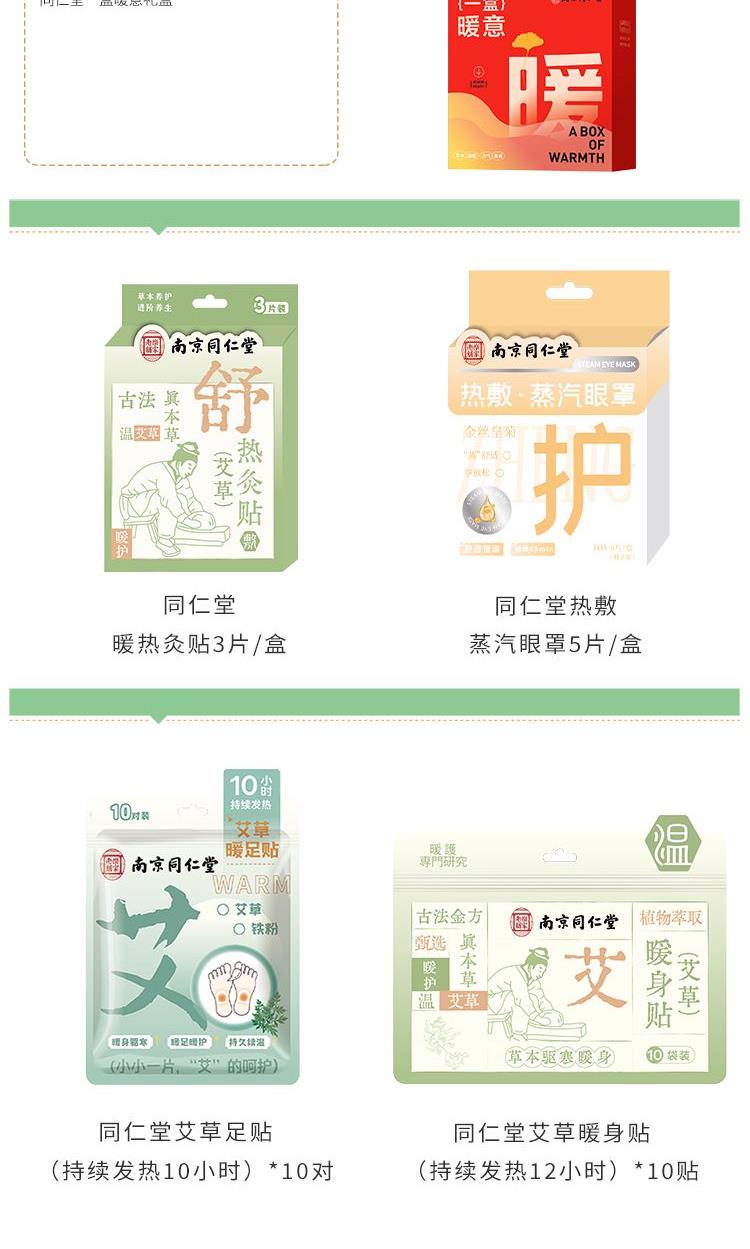 同仁堂艾草暖身贴(持续发热12小时)*10贴 同仁堂艾草足贴(持续发热10小时)*10对 同仁堂热敷蒸汽眼罩5片/盒 同仁堂暖热灸贴3片/盒 思珀莱一盒暖意礼盒