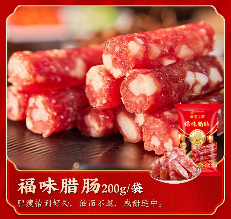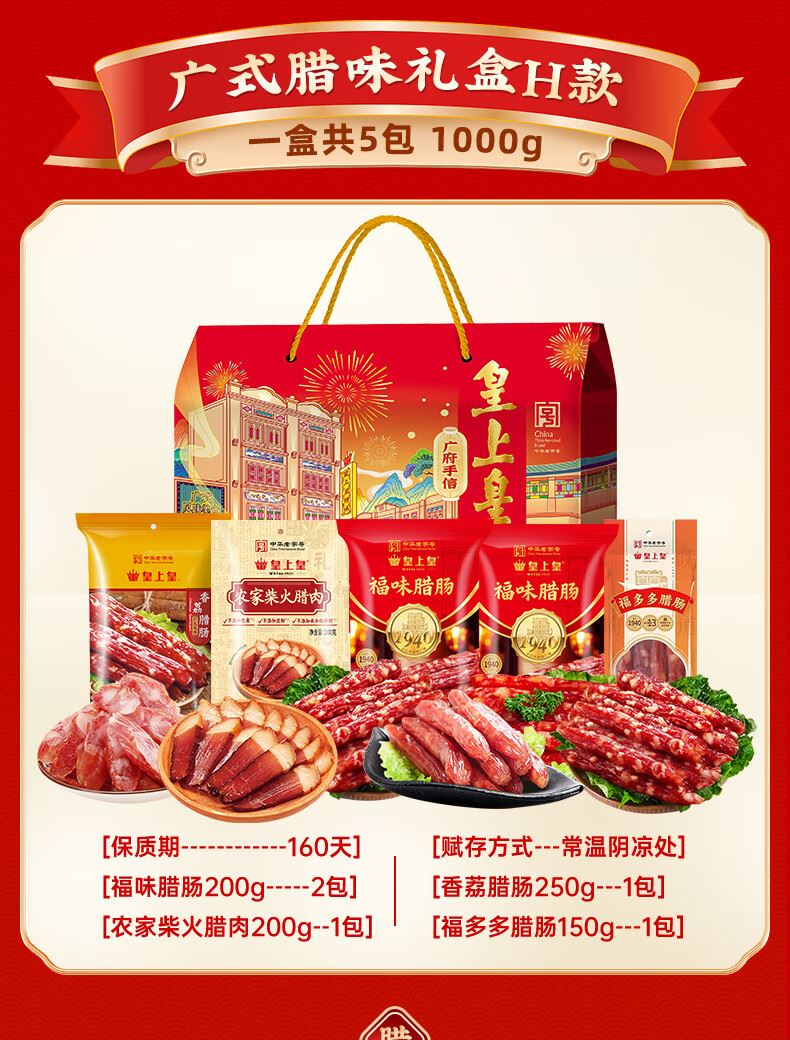 产地:广东 特产品类:广式腊肠 口味:原味 食用方法:烹饪食用 加工工艺:烘干 保质期:120天 总净含量:1000g 内配:三鲜腊肠200g*2 福多多腊肠150g*1 农家柴火腊肉200g*1 香荔腊肠250g*1 广式腊味礼盒*1