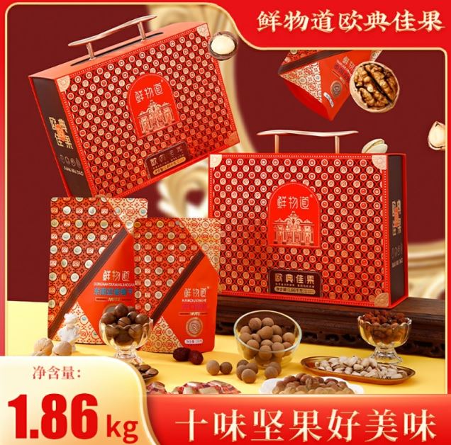 配置: 美国开心果80g 美国大榛子100g 奶香夏威夷果100g 开口杏核150g 新疆薄皮核桃100g 智利提子干200g 东南亚香蕉干150g 泰国龙眼干150g 若羌灰枣250g 若羌灰枣250g 山楂卷330g 总重量:1.86KG