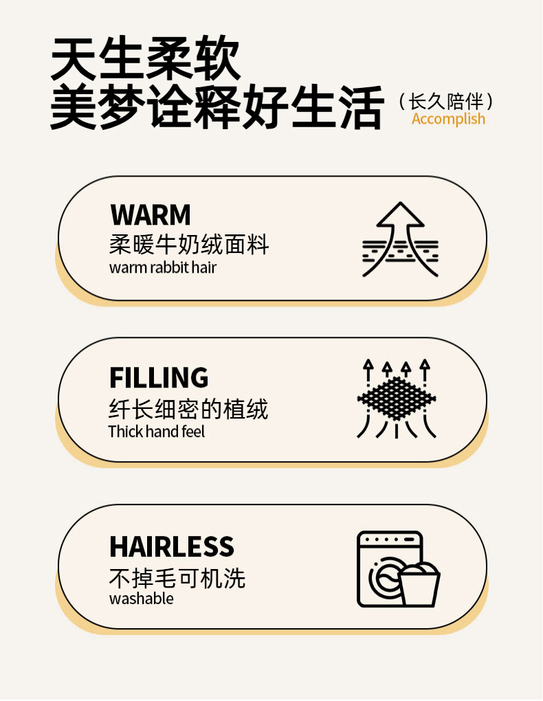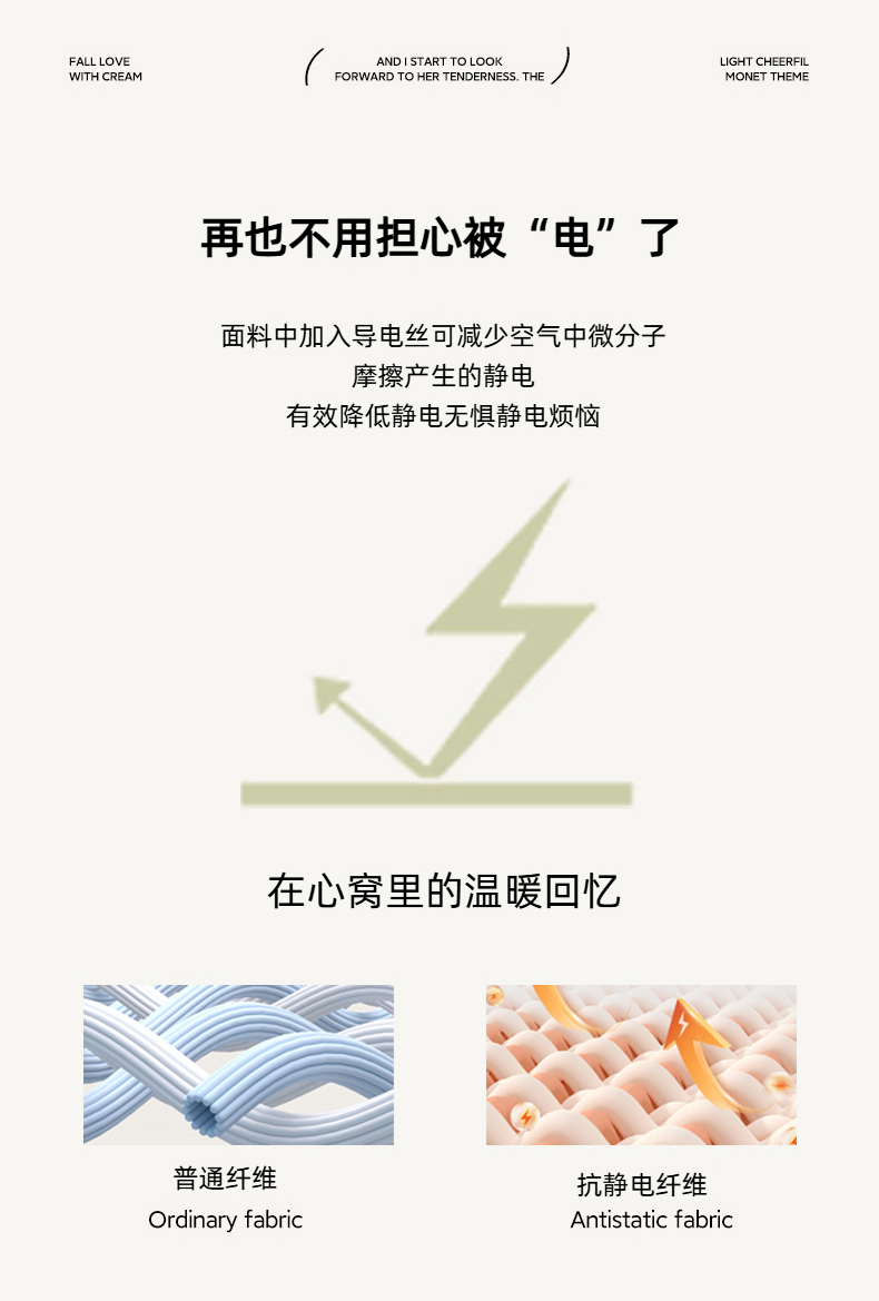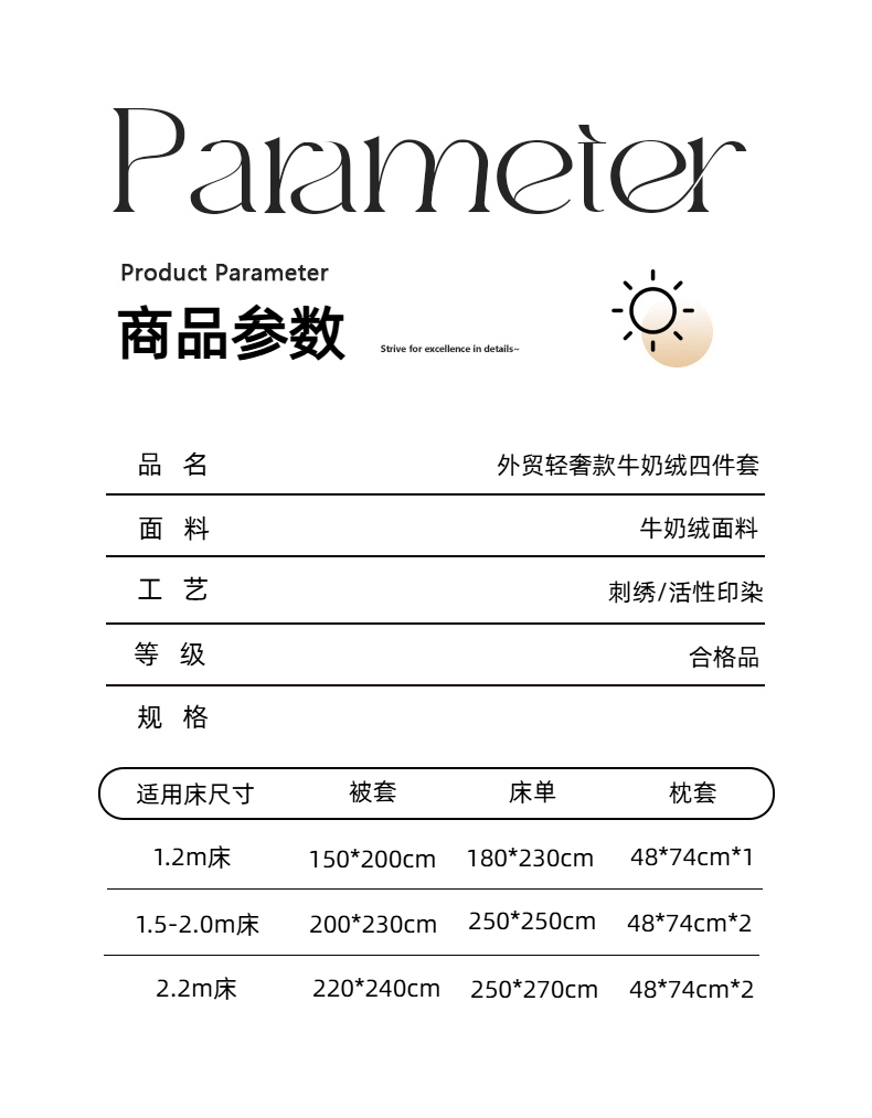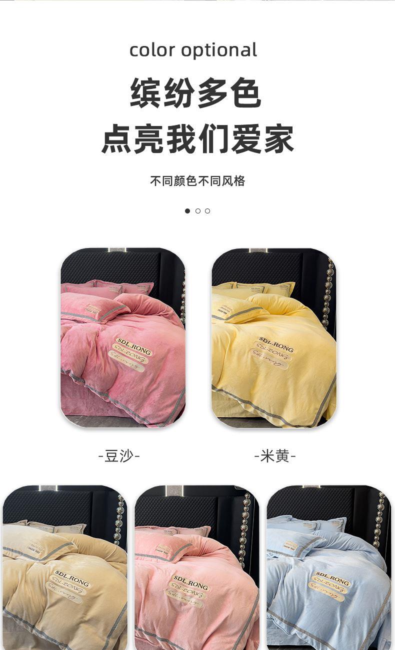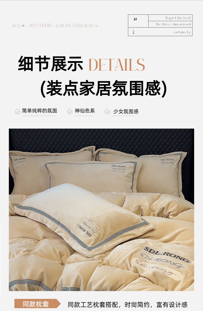 规格:适合1.5M-1.8M床 被套200*230cm 床单250*250cm 枕套48*74cm*2 面料:高克重牛奶绒/聚酯纤维 工艺:织带花边+刺绣工艺+圆角吊边床单 花色:时光驼,时光粉,时光天蓝,时光豆沙,时光米黄 时尚简约·低调轻奢 更心动了 甄选加厚牛奶绒面料,蓬松不掉毛 ,厚实软糯🌸吸湿透气,带来牛奶般的肌肤触感☀️,A类级别➕织入加密导电丝 科技防静电 拒绝静电让睡眠更健康;织带设计搭配精美刺绣,打造格调生活。