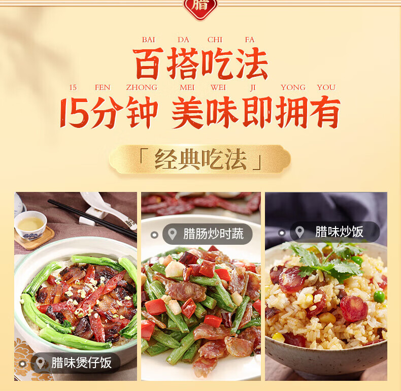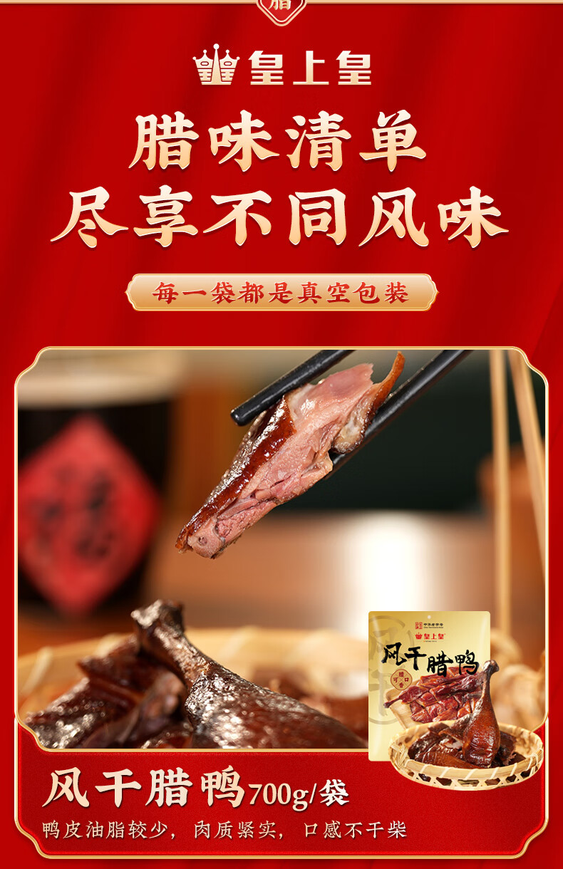 产地:广东 特产品类:广式腊肠 口味:原味 食用方法:烹饪食用 加工工艺:烘干 保质期:120天 内配:风干腊鸭700g*1 福多多腊肠150g*2 三鲜腊肠200g*1 广式腊味礼盒*1