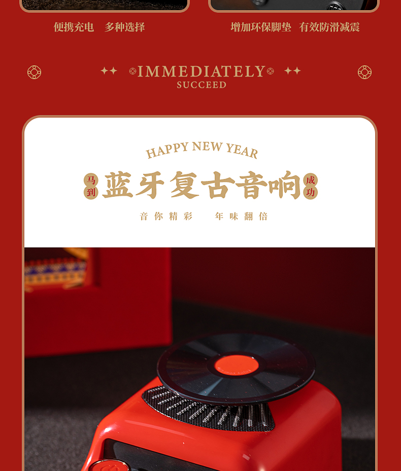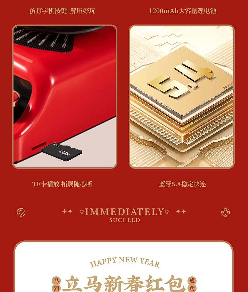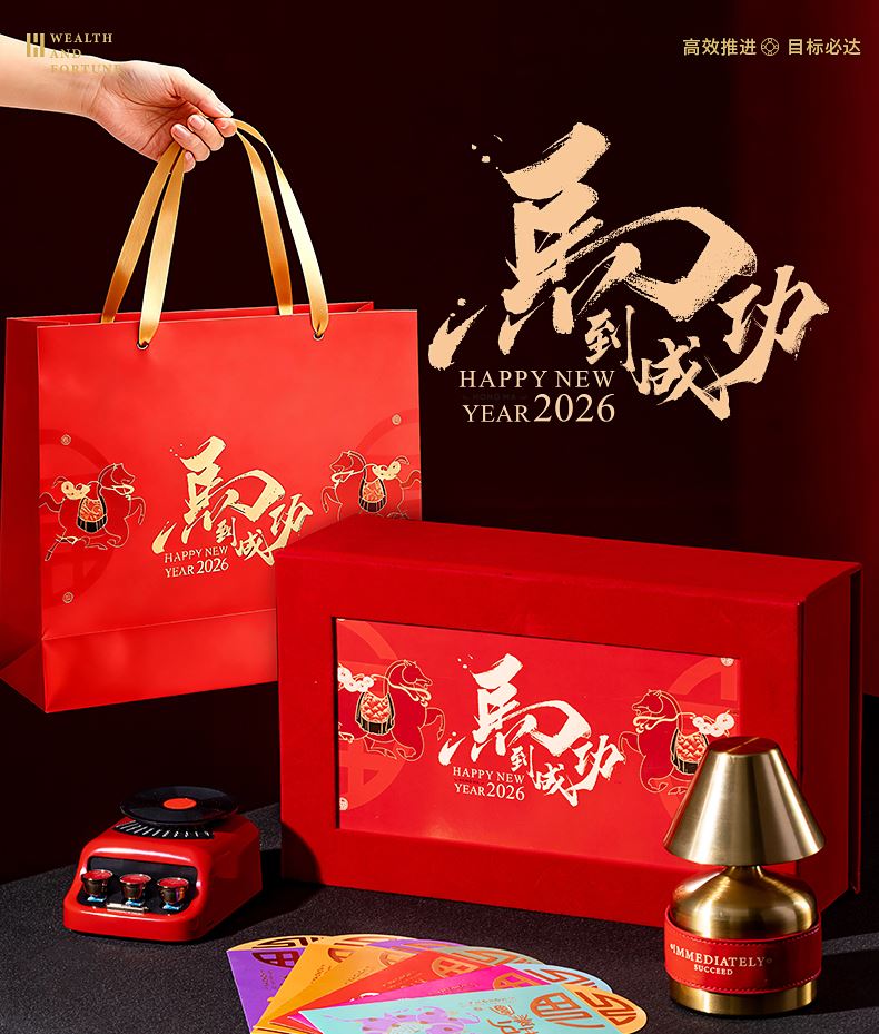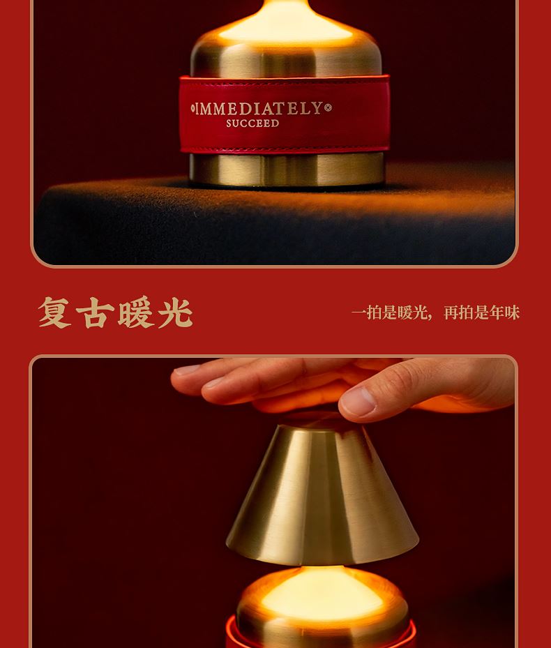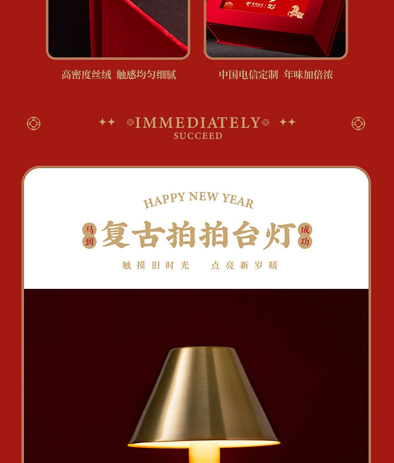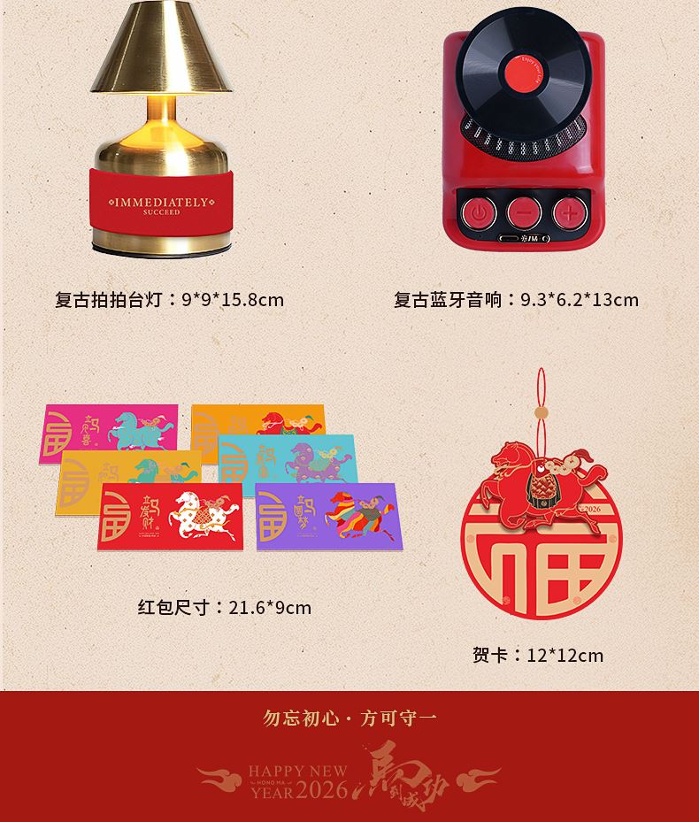 1、复古拍拍小台灯:三色变光 触感变色 无极调光 2、好运复古蓝牙音箱:蓝牙、氛围灯、趣味按键 3、新年红包*6:开启新年好运程 4、绒面礼盒:日历功能、收纳功能 用完不闲置 注:礼盒可专版定制画面