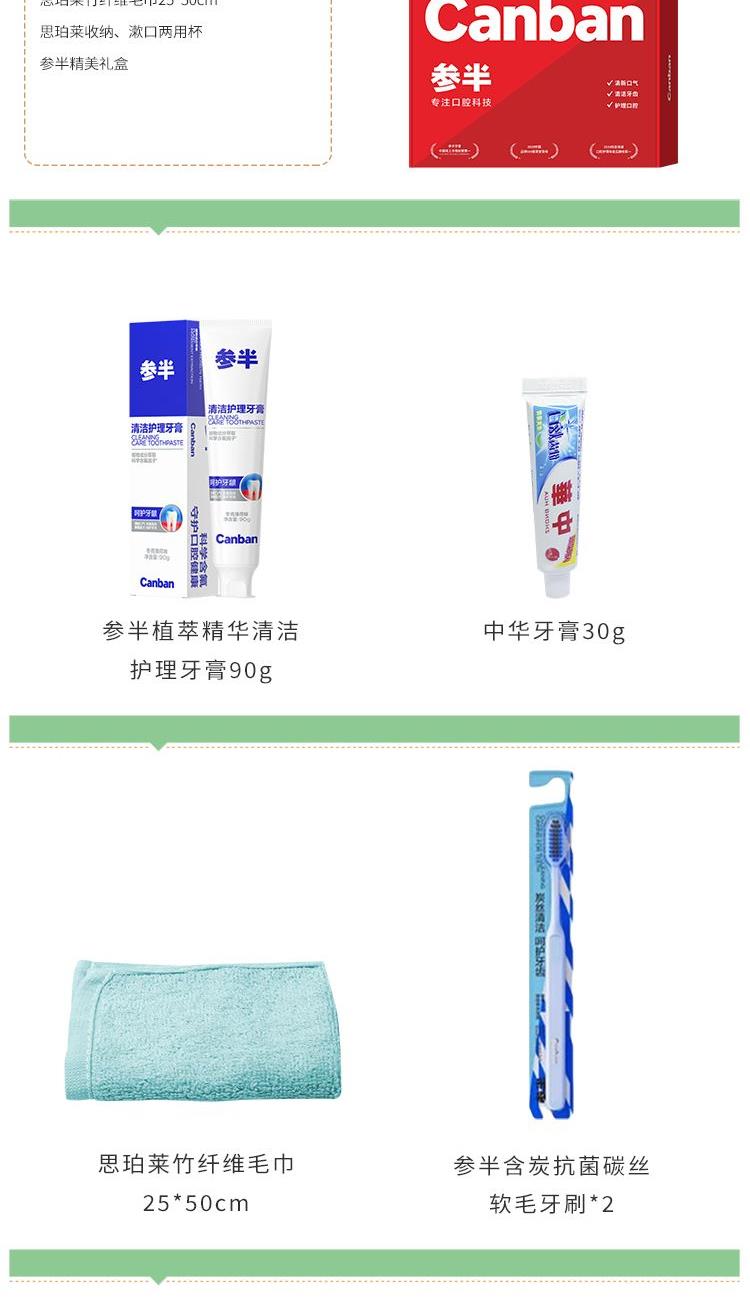 参半植萃精华清洁护理牙膏90g 参半含炭碳丝软毛牙刷 参半含炭碳丝软毛牙刷 中华牙膏30g 思珀莱竹纤维毛巾25*50cm 思珀莱收纳、漱口两用杯 思珀莱精美礼盒