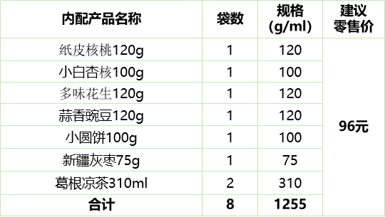 纸皮核桃120g 1 120 小白杏核100g 1 100 多味花生120g 1 120 蒜香豌豆120g 1 120 小圆饼100g 1 100 新疆灰枣75g 1 75 葛根凉茶310ml 2 310 合计 8 1255