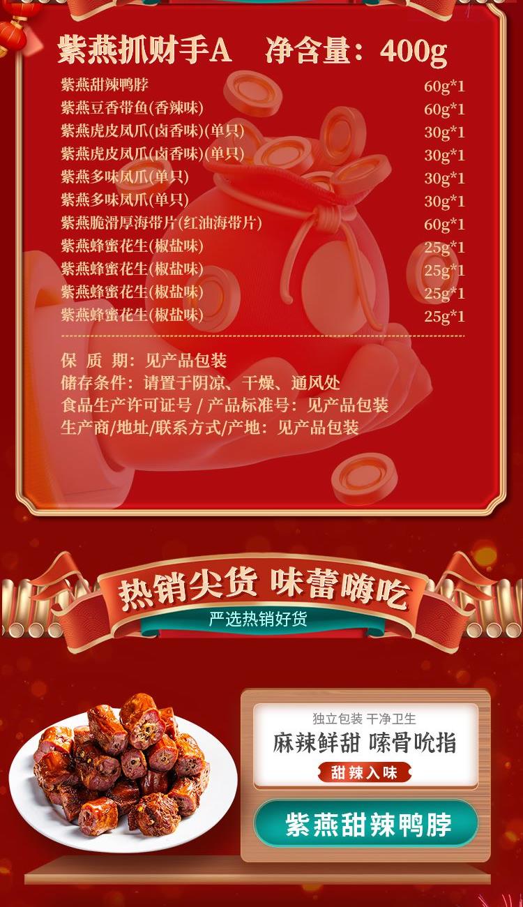 紫燕甜辣鸭脖60g*1 紫燕豆香带鱼(香辣味)60g*1 紫燕虎皮凤爪(卤香味)(单只)30g*1 紫燕虎皮凤爪(卤香味)(单只)30g*1 紫燕多味凤爪(单只)30g*1 紫燕多味凤爪(单只)30g*1 紫燕脆滑厚海带片(红油海带片)60g*1 紫燕蜂蜜花生(椒盐味)25g*1 紫燕蜂蜜花生(椒盐味)25g*1 紫燕蜂蜜花生(椒盐味)25g*1 紫燕蜂蜜花生(椒盐味)25g*1 礼盒+组装+外盒