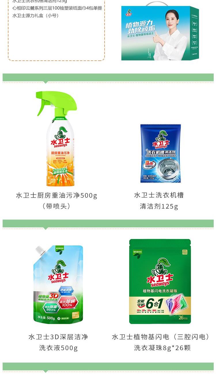 水卫士植物基闪电(三腔闪电)洗衣凝珠8g*26颗 水卫士3D深层洁净洗衣液500g 水卫士厨房重油污净500g(带喷头) 水卫士洗衣机槽清洁剂125g 心相印云麓系列三层100抽塑装纸面巾4包单提 思珀莱源力礼盒(净含量1833g 小号)