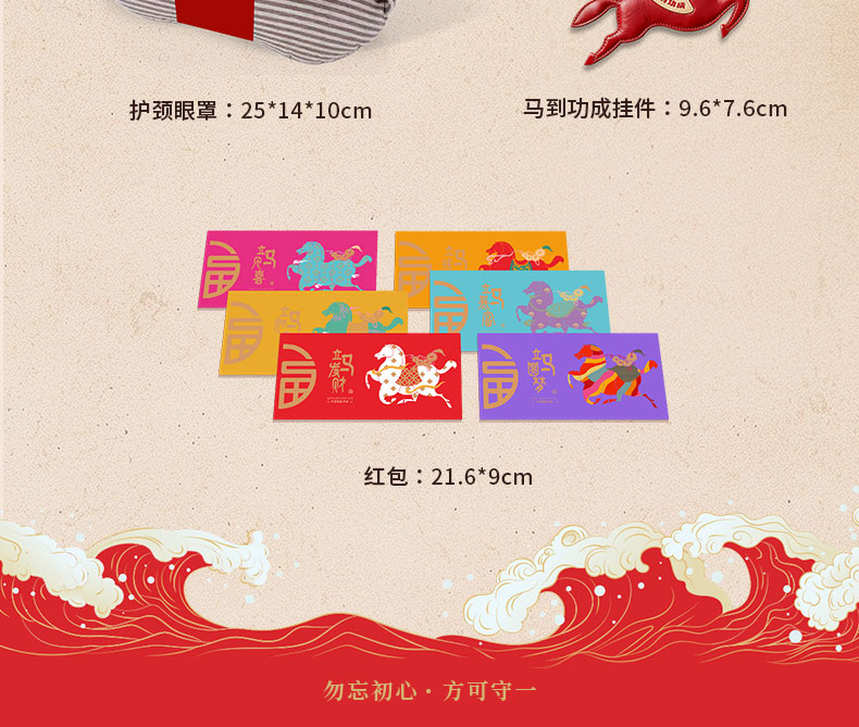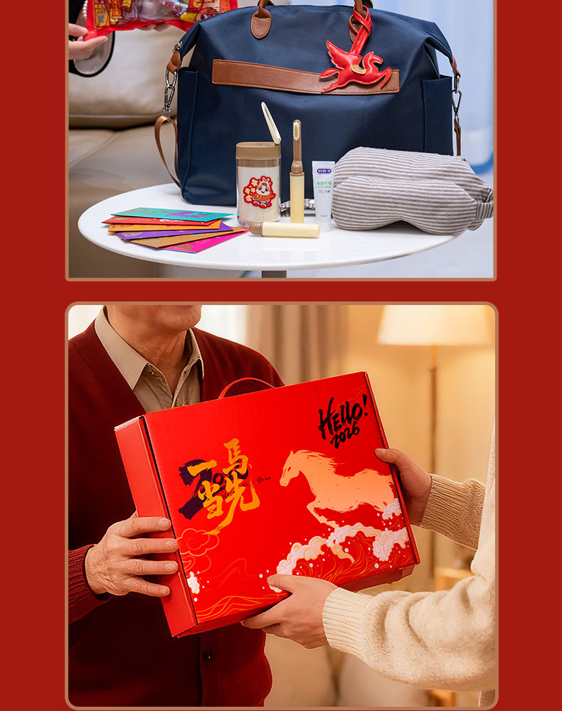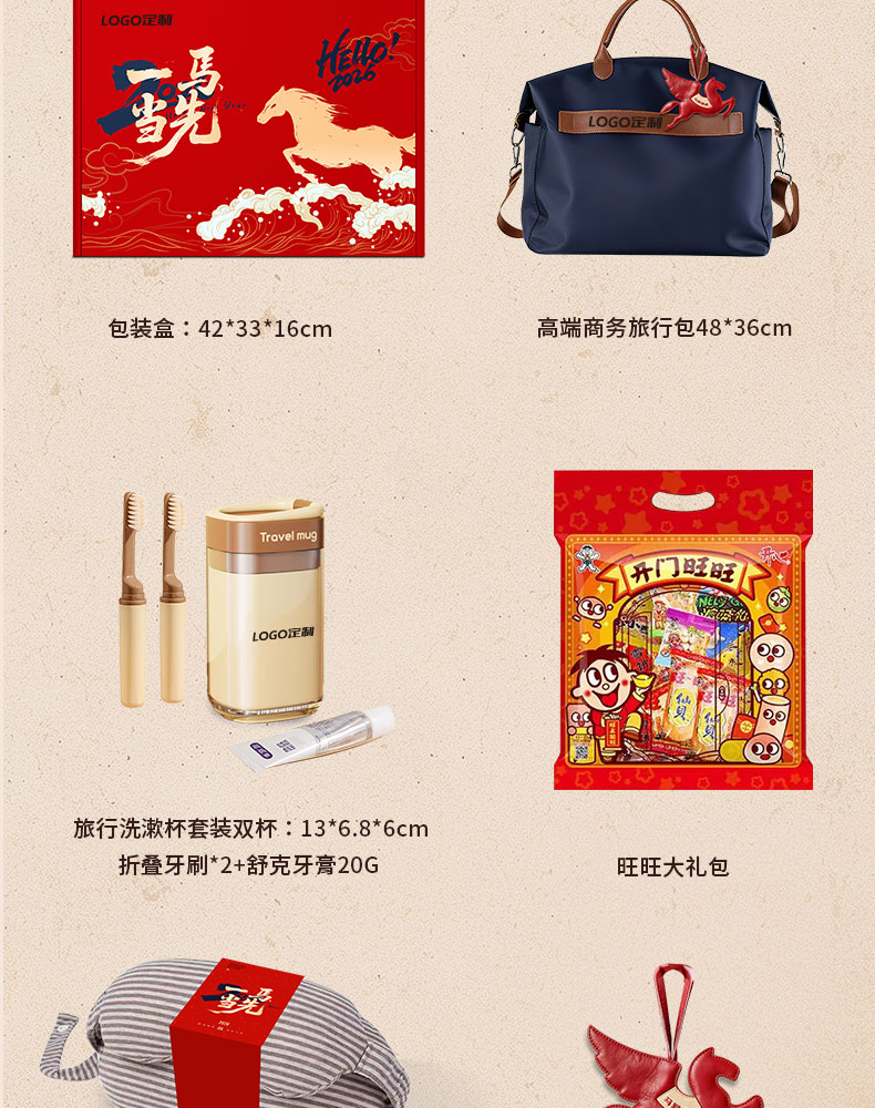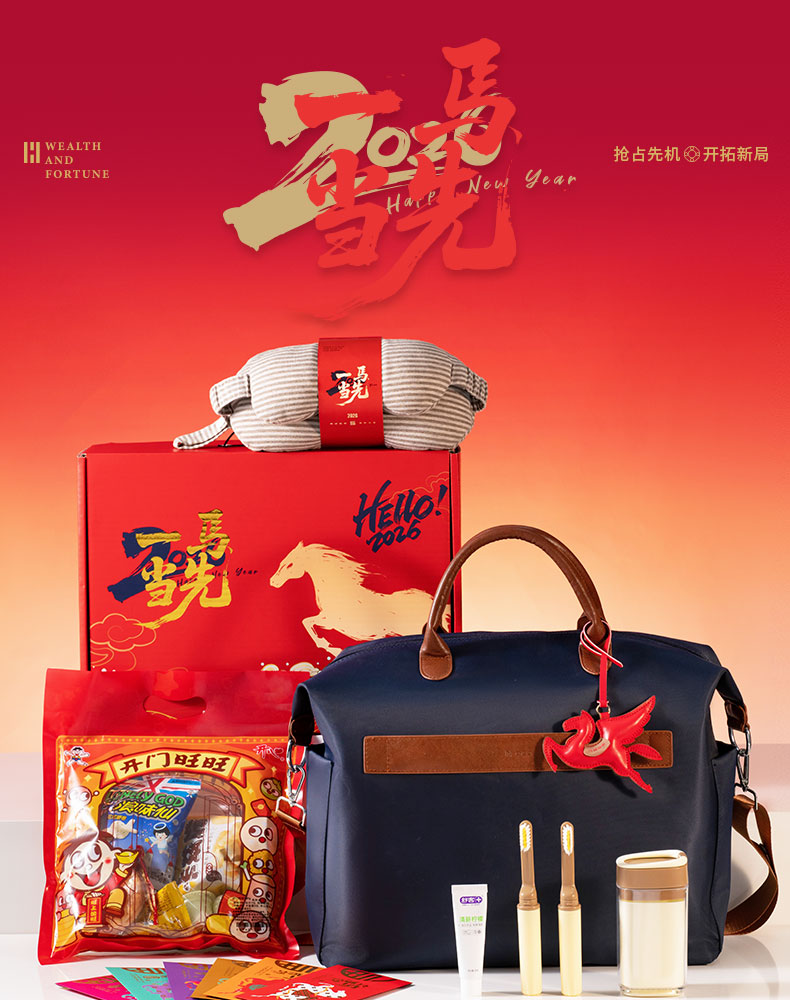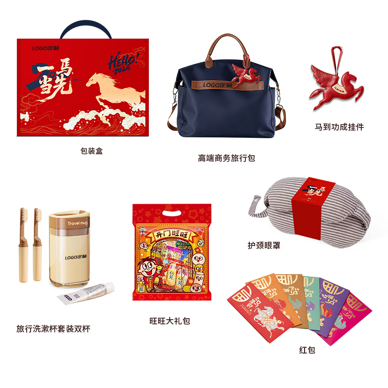 1.商务旅行包装下出行所需 2.专属飞马钥匙扣挂于包上,每一次出发都有好运随行 3.多功能枕颈,缓解奔波疲惫,让每段旅程都有舒适依靠 4.旺旺大礼包, 借“旺”的好彩头,为孩子、为全家加持一整年的好运,愿新岁事事顺、样 5.旅行洗漱杯配一次性牙刷、牙膏,不用再费心分装,高铁站、酒店用着都方便,让旅途更清爽; 6. 6个马年红包藏满新年期许