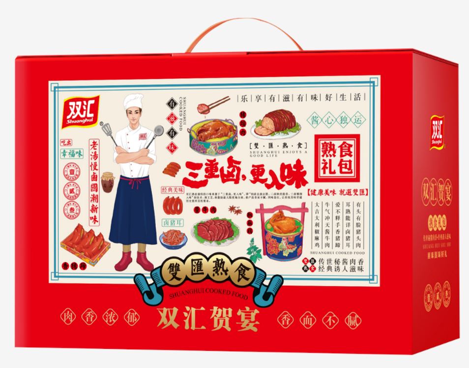 双汇酱卤牛肉130g 双汇酱卤牛肉130g 双汇香熏烤鸡500g 双汇香嫩烤肉肠300g 双汇香卤猪头肉200g 双汇水晶猪皮冻360g 双汇五香卤猪肝250g 双汇香辣烤肉排300g 双汇香辣烤鸭腿240g 净含量:2410g 保质期:6个月 箱 规:6盒/箱 储存条件:常温