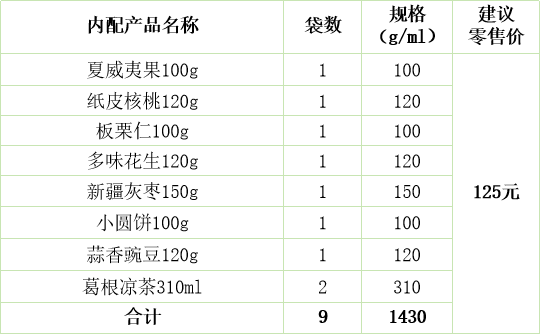 夏威夷果100g 1 100 纸皮核桃120g 1 120 板栗仁100g 1 100 多味花生120g 1 120 新疆灰枣150g 1 150 小圆饼100g 1 100 蒜香豌豆120g 1 120 葛根凉茶310ml 2 310 合计 9 1430