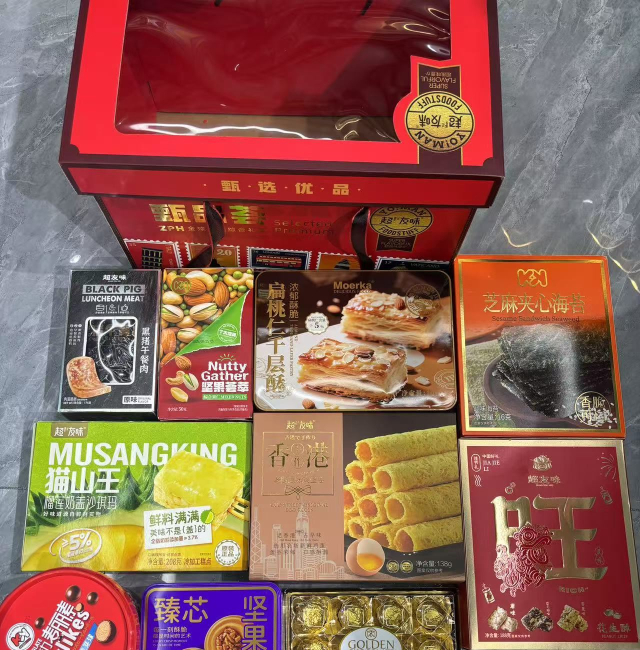 1.黑猪午餐肉 2.坚果荟萃 3.扁桃仁千层酥 4.芝麻夹心海苔 5.猫山王榴莲沙琪玛 6.老街鸡蛋卷 7.旺花生酥 8.巧克力麦丽素 9.臻芯坚果脆 10.12粒方盒巧克力